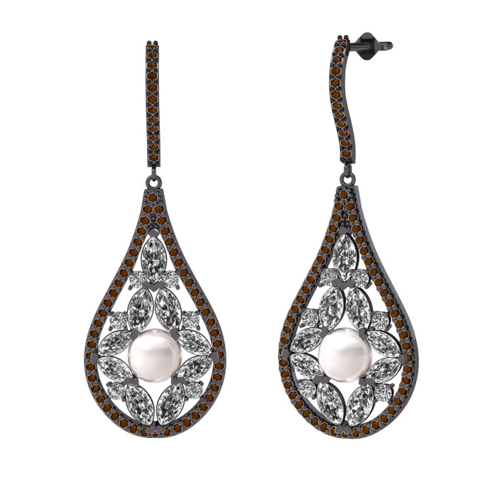 Inci, beyaz zirkon ve dumanlı kuvars 925 ayar siyah rodyum kaplama gümüş küpe