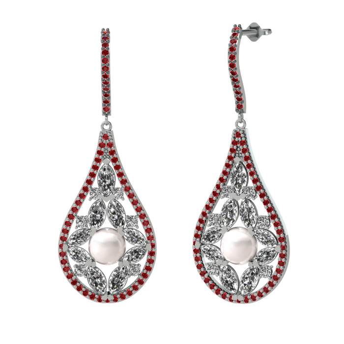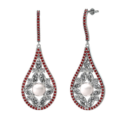 Inci, beyaz zirkon ve garnet 14 ayar beyaz altın küpe