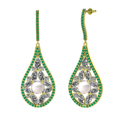 Inci, beyaz zirkon ve kök zümrüt 8 ayar altın küpe