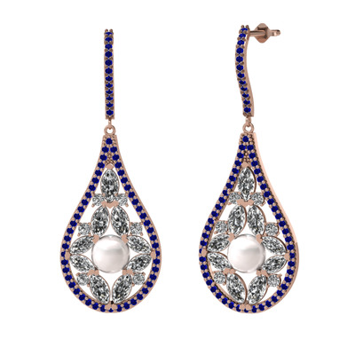 Inci, beyaz zirkon ve lab safir 8 ayar rose altın küpe