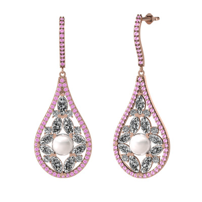 Inci, beyaz zirkon ve pembe kuvars 14 ayar rose altın küpe