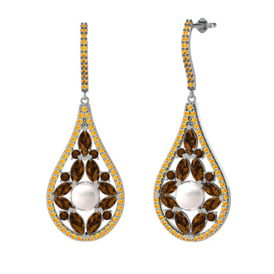 Inci, dumanlı kuvars ve sitrin 8 ayar beyaz altın küpe