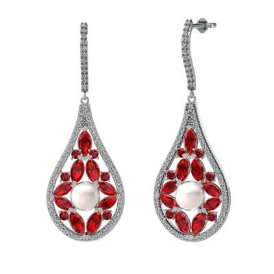 Inci, garnet ve beyaz zirkon 8 ayar beyaz altın küpe