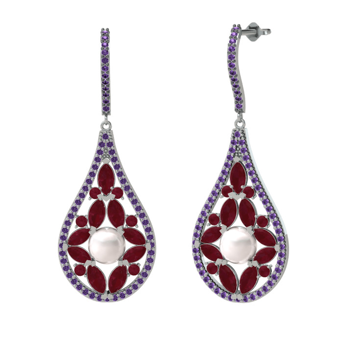 Inci, kök yakut ve ametist 14 ayar beyaz altın küpe