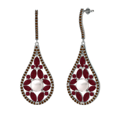 Inci, kök yakut ve dumanlı kuvars 8 ayar beyaz altın küpe