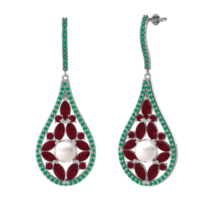 Inci, kök yakut ve kök zümrüt 18 ayar beyaz altın küpe