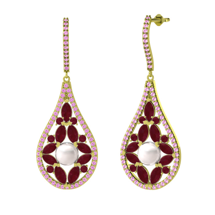 Inci, kök yakut ve pembe kuvars 14 ayar altın küpe