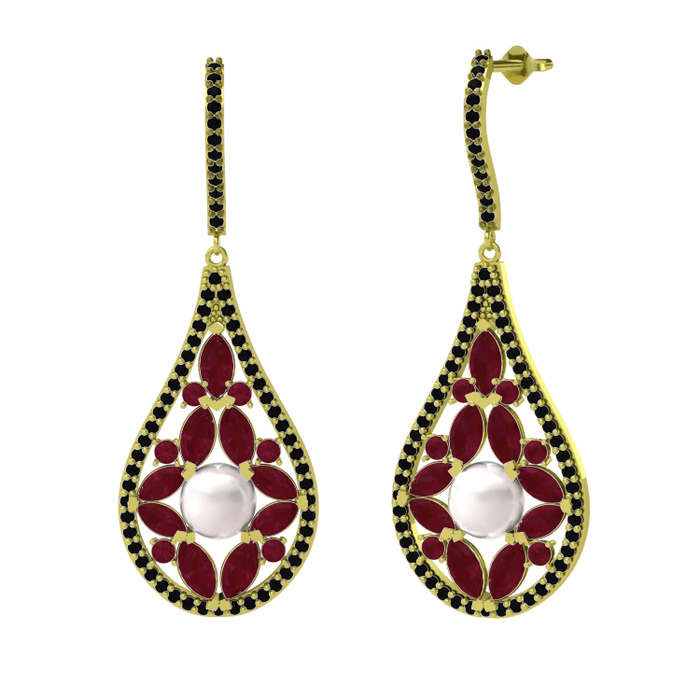 Inci, kök yakut ve siyah zirkon 18 ayar altın küpe