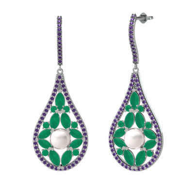 Inci, kök zümrüt ve ametist 18 ayar beyaz altın küpe
