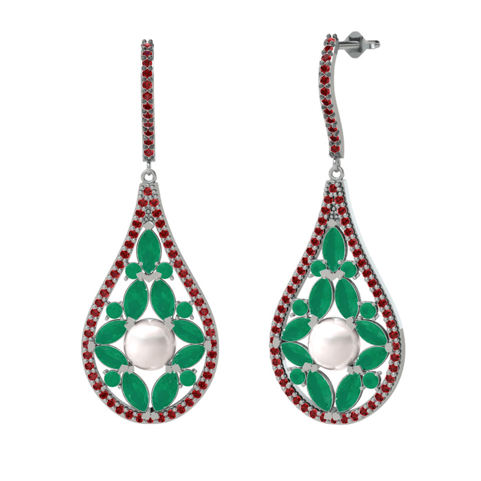 Inci, kök zümrüt ve garnet 8 ayar beyaz altın küpe