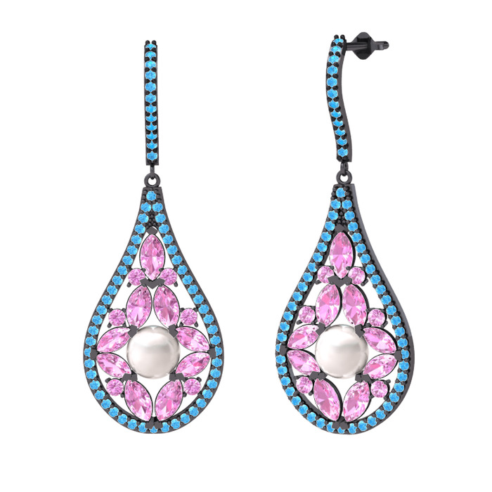 Inci, pembe kuvars ve akuamarin 925 ayar siyah rodyum kaplama gümüş küpe