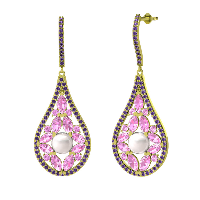 Inci, pembe kuvars ve ametist 8 ayar altın küpe