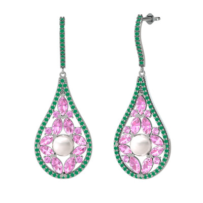 Inci, pembe kuvars ve kök zümrüt 18 ayar beyaz altın küpe