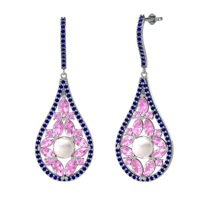 Inci, pembe kuvars ve lab safir 14 ayar beyaz altın küpe