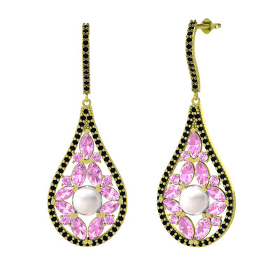 Inci, pembe kuvars ve siyah zirkon 8 ayar altın küpe