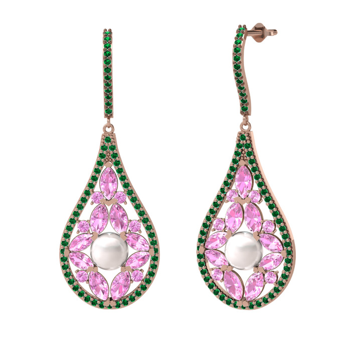 Inci, pembe kuvars ve yeşil kuvars 14 ayar rose altın küpe