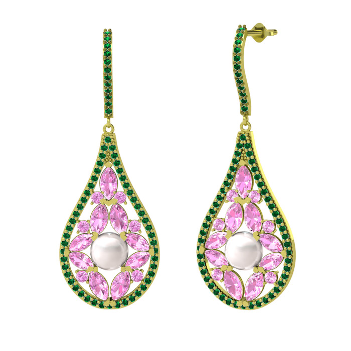 Inci, pembe kuvars ve yeşil kuvars 18 ayar altın küpe