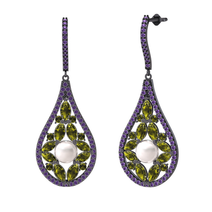 Inci, peridot ve ametist 925 ayar siyah rodyum kaplama gümüş küpe