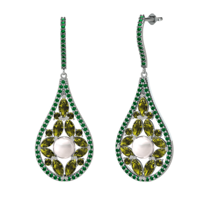 Inci, peridot ve yeşil kuvars 8 ayar beyaz altın küpe
