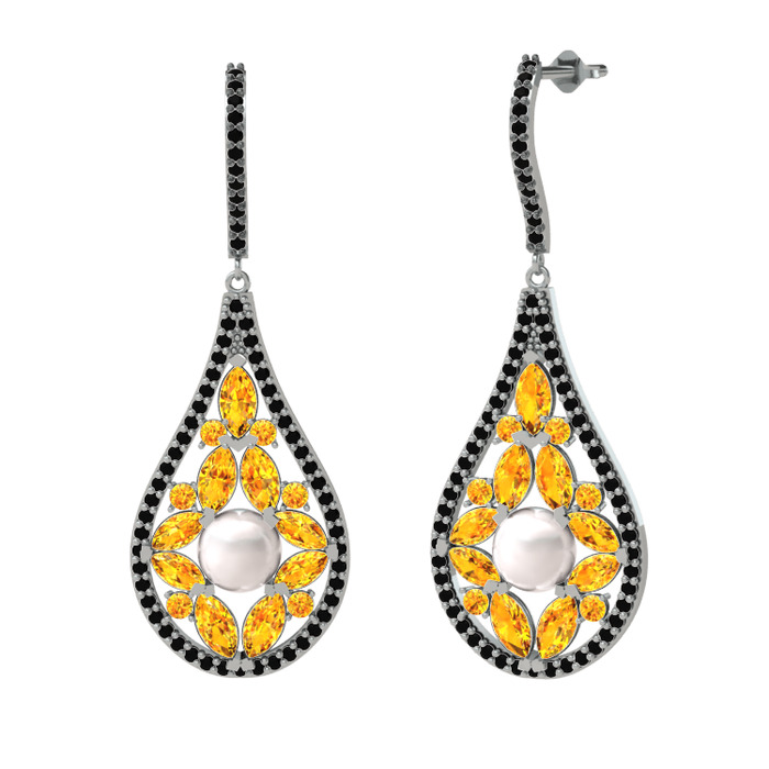 Inci, sitrin ve siyah zirkon 14 ayar beyaz altın küpe