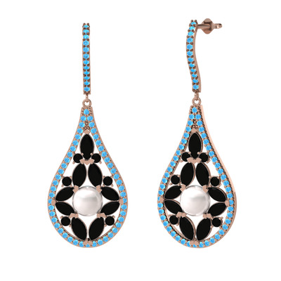 Inci, siyah zirkon ve akuamarin 925 ayar rose altın kaplama gümüş küpe