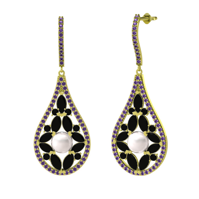 Inci, siyah zirkon ve ametist 18 ayar altın küpe