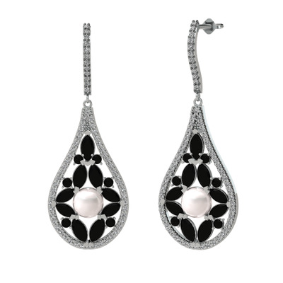 Inci, siyah zirkon ve beyaz zirkon 14 ayar beyaz altın küpe