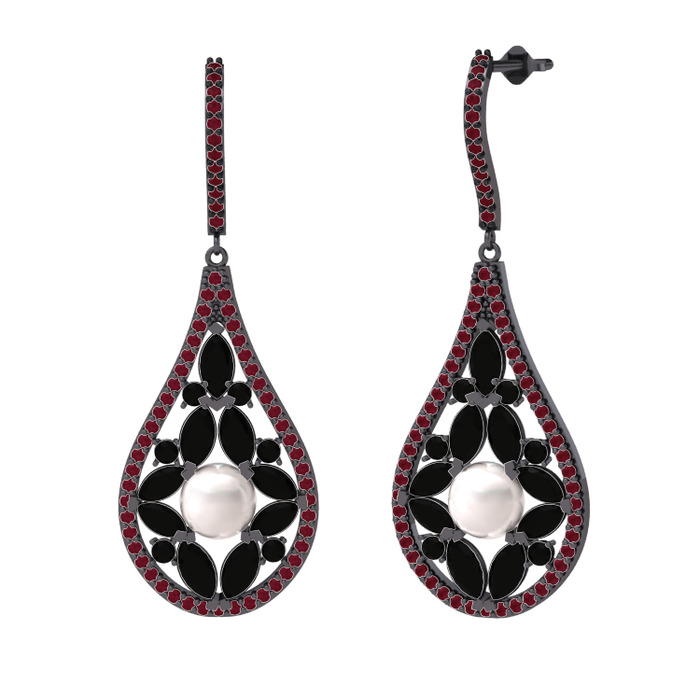 Inci, siyah zirkon ve kök yakut 925 ayar siyah rodyum kaplama gümüş küpe