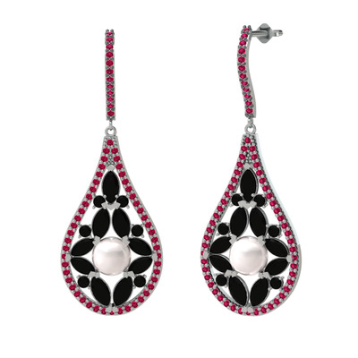 Inci, siyah zirkon ve rodolit garnet 14 ayar beyaz altın küpe