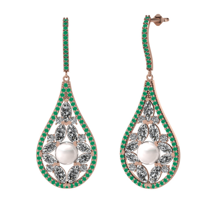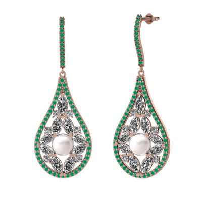 Inci, swarovski ve kök zümrüt 18 ayar rose altın küpe