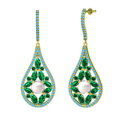 Inci, yeşil kuvars ve akuamarin 14 ayar altın küpe