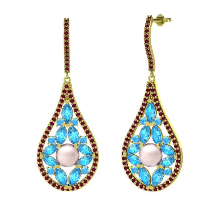 Pembe inci, akuamarin ve kök yakut 18 ayar altın küpe