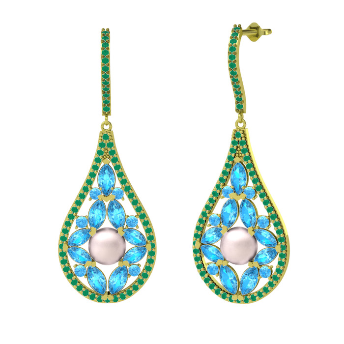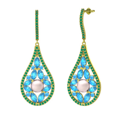 Pembe inci, akuamarin ve kök zümrüt 14 ayar altın küpe