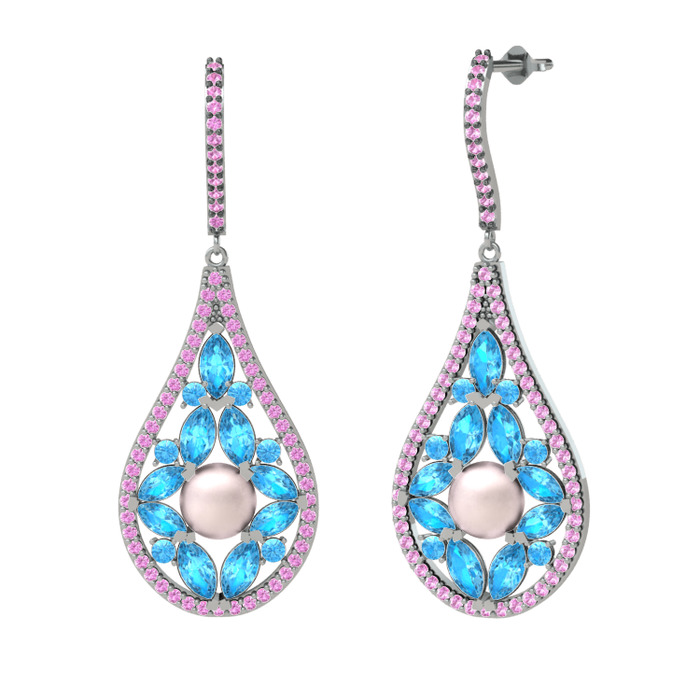 Pembe inci, akuamarin ve pembe kuvars 8 ayar beyaz altın küpe