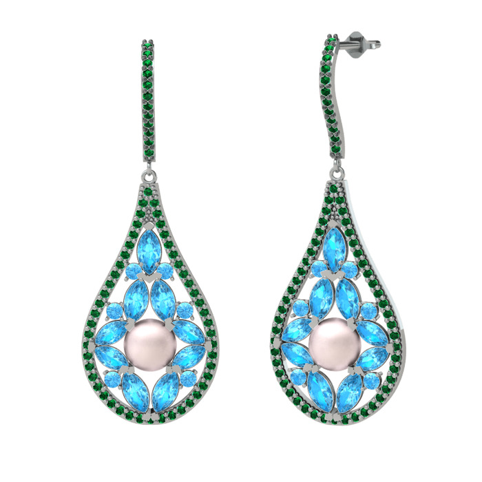 Pembe inci, akuamarin ve yeşil kuvars 14 ayar beyaz altın küpe
