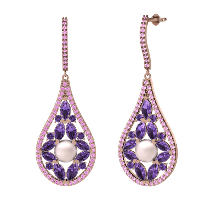 Pembe inci, ametist ve pembe kuvars 14 ayar rose altın küpe