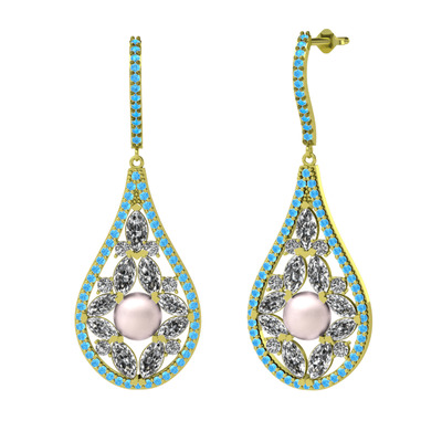 Pembe inci, beyaz zirkon ve akuamarin 14 ayar altın küpe