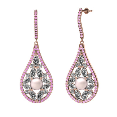 Pembe inci, beyaz zirkon ve pembe kuvars 18 ayar rose altın küpe