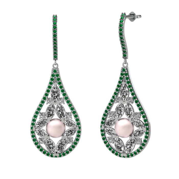 Pembe inci, beyaz zirkon ve yeşil kuvars 14 ayar beyaz altın küpe