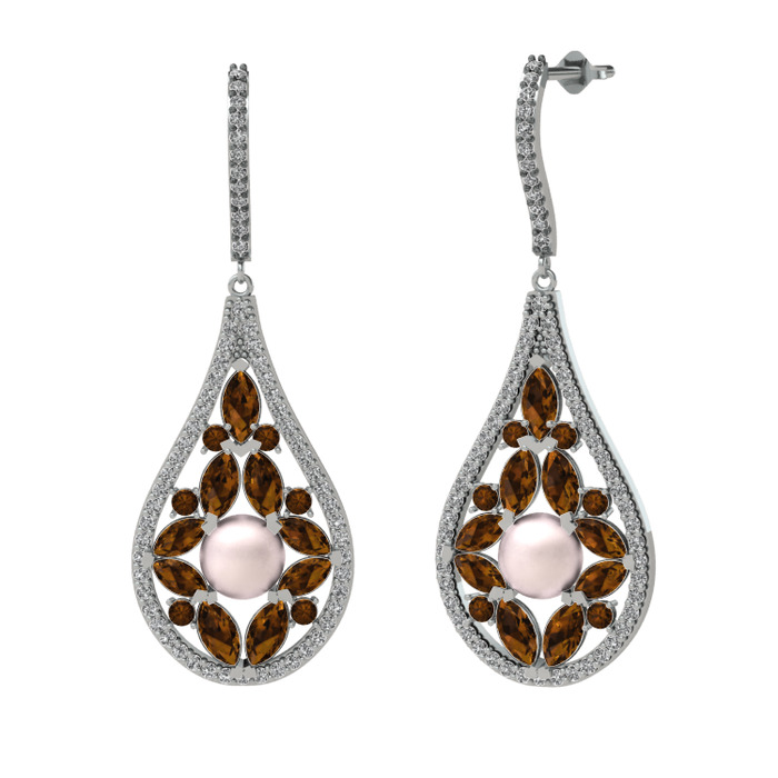 Pembe inci, dumanlı kuvars ve beyaz zirkon 14 ayar beyaz altın küpe
