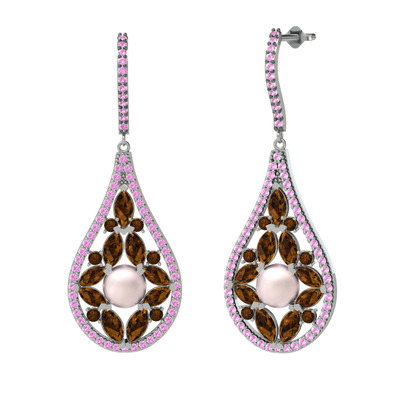 Pembe inci, dumanlı kuvars ve pembe kuvars 14 ayar beyaz altın küpe