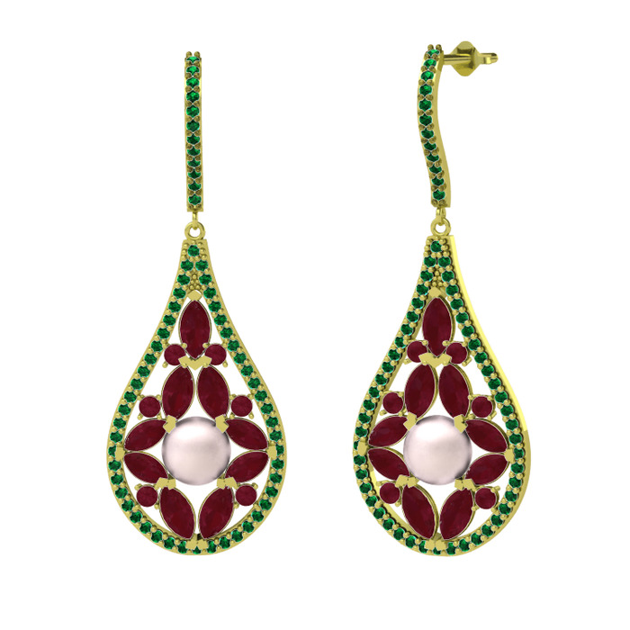 Pembe inci, kök yakut ve yeşil kuvars 925 ayar altın kaplama gümüş küpe