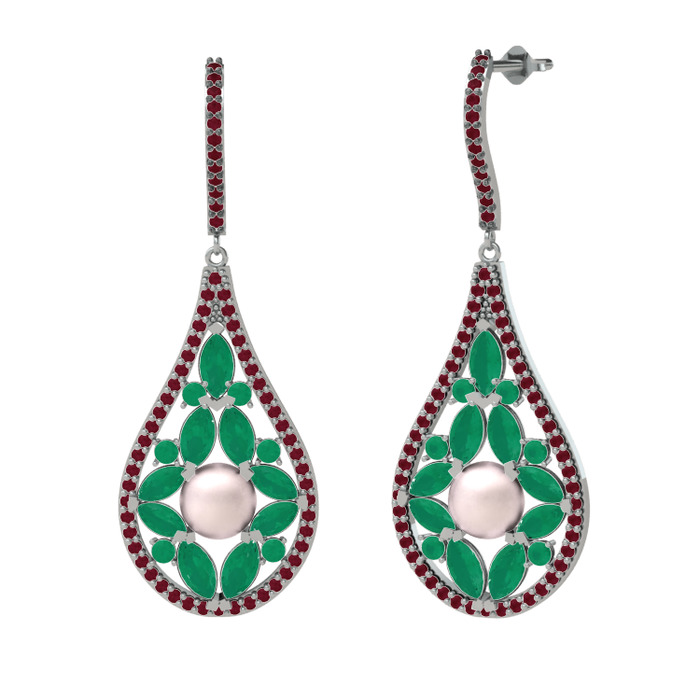 Pembe inci, kök zümrüt ve kök yakut 8 ayar beyaz altın küpe