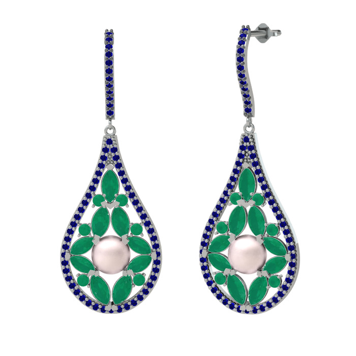 Pembe inci, kök zümrüt ve lab safir 8 ayar beyaz altın küpe