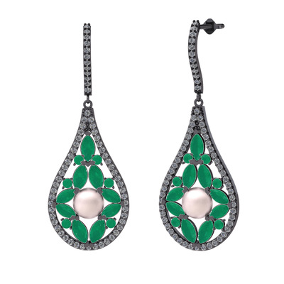 Pembe inci, kök zümrüt ve pırlanta 925 ayar siyah rodyum kaplama gümüş küpe (1.11 karat)