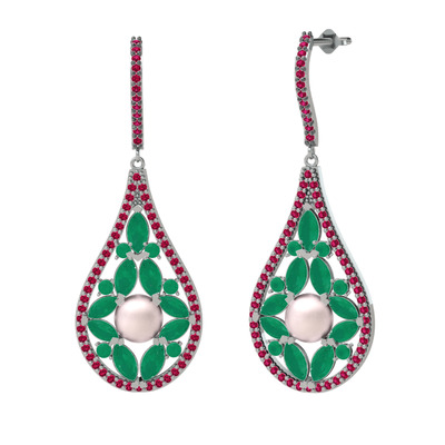Pembe inci, kök zümrüt ve rodolit garnet 18 ayar beyaz altın küpe