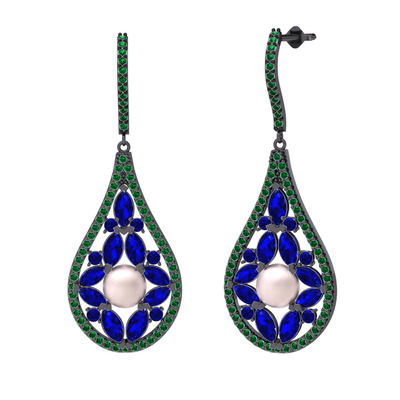 Pembe inci, lab safir ve yeşil kuvars 925 ayar siyah rodyum kaplama gümüş küpe