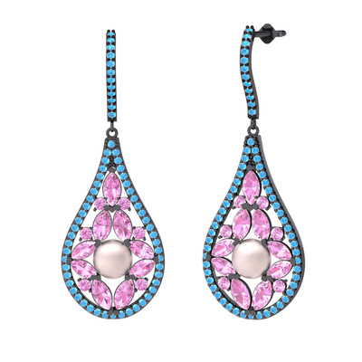Pembe inci, pembe kuvars ve akuamarin 925 ayar siyah rodyum kaplama gümüş küpe