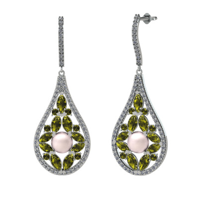 Pembe inci, peridot ve pırlanta 8 ayar beyaz altın küpe (1.11 karat)