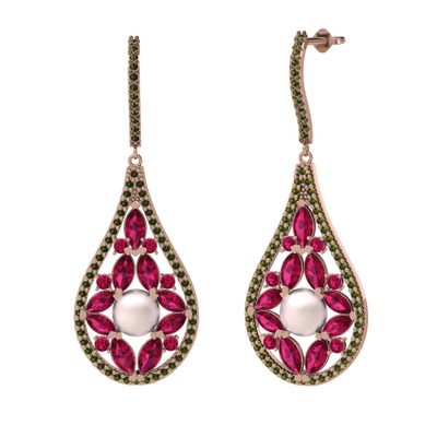 Pembe inci, rodolit garnet ve peridot 18 ayar rose altın küpe